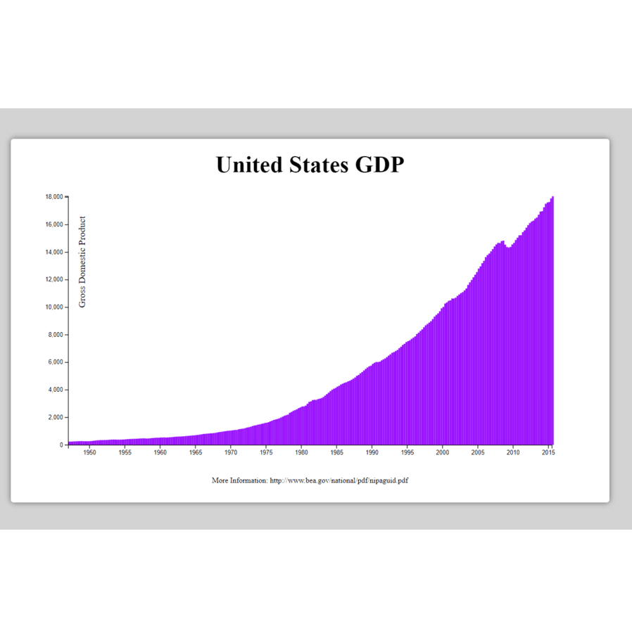 Explore the rise of a nation through this dynamic D3.js bar chart. Unveiling the story of American economic expansion, it translates raw data into a visually compelling narrative, showcasing the United States' Gross Domestic Product (GDP) from 1946 to 2015. Each bar represents a year, its height revealing the economic pulse of the nation. This interactive visualization offers a glimpse into decades of growth, prosperity, and potential turning points in the American economic story.
