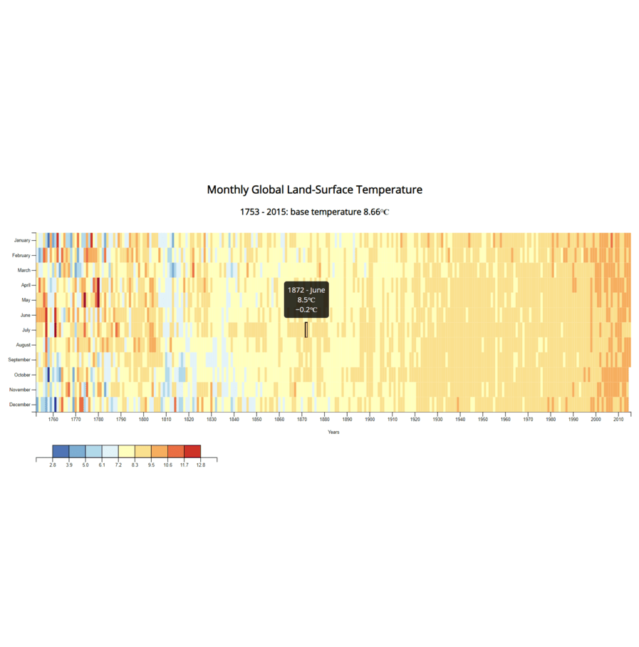 Delve into Earth's climate history with this interactive D3.js heatmap. Unveiling a hidden dimension of time, it visualizes the subtle variations in monthly land temperatures across the globe, spanning a staggering 263 years (1753-2015). Witness the ebb and flow of our planet's thermal fingerprint, and uncover potential trends hidden within the vast tapestry of climate data.