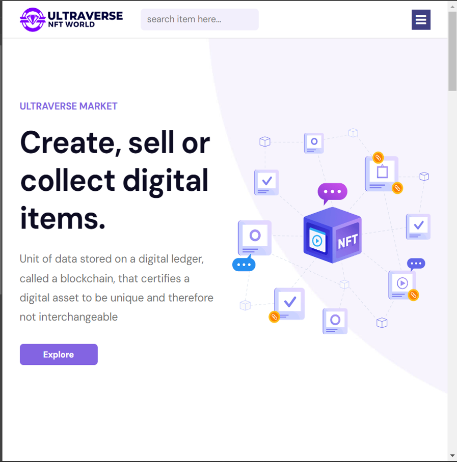 Ultraverse, my React.js masterpiece, is a cutting-edge NFT marketplace born from the Front-End Simplified course. It's a responsive NFT marketplace where users seamlessly explore NFTs, filter based on preferences, and discover trending collections, top creators, and new releases. Thanks to collaborative debugging with Front-End Simplified interns, Ultraverse offers a sleek, userfriendly experience. Some features include the ability to follow favorite creators and view individual NFT details, making it a dynamic and engaging marketplace.