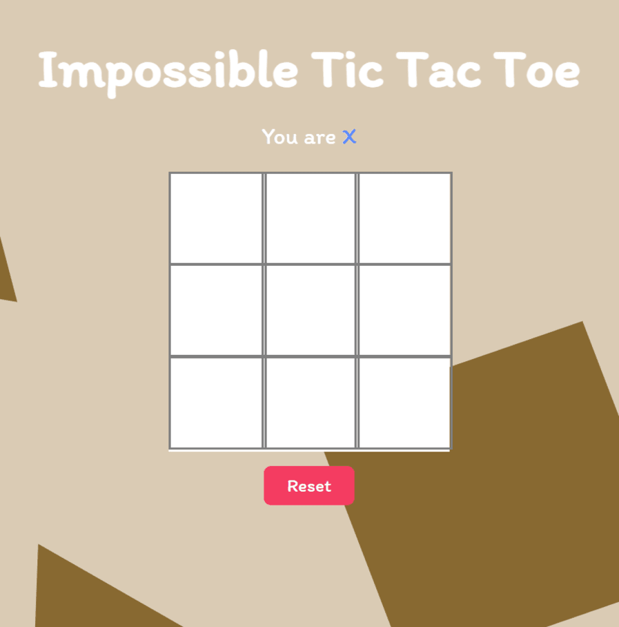 Explore my personal project, the "Impossible-To-Beat TicTacToe" web game. In this innovative creation, players consistently initiate the game against an AI that either secures a tie or wins. Leveraging strategic algorithms, this project showcases my skills in game development, artificial intelligence, and web design. The app offers an engaging and challenging experience, reflecting my commitment to pushing boundaries in web development and creating unique, unbeatable gaming solutions.